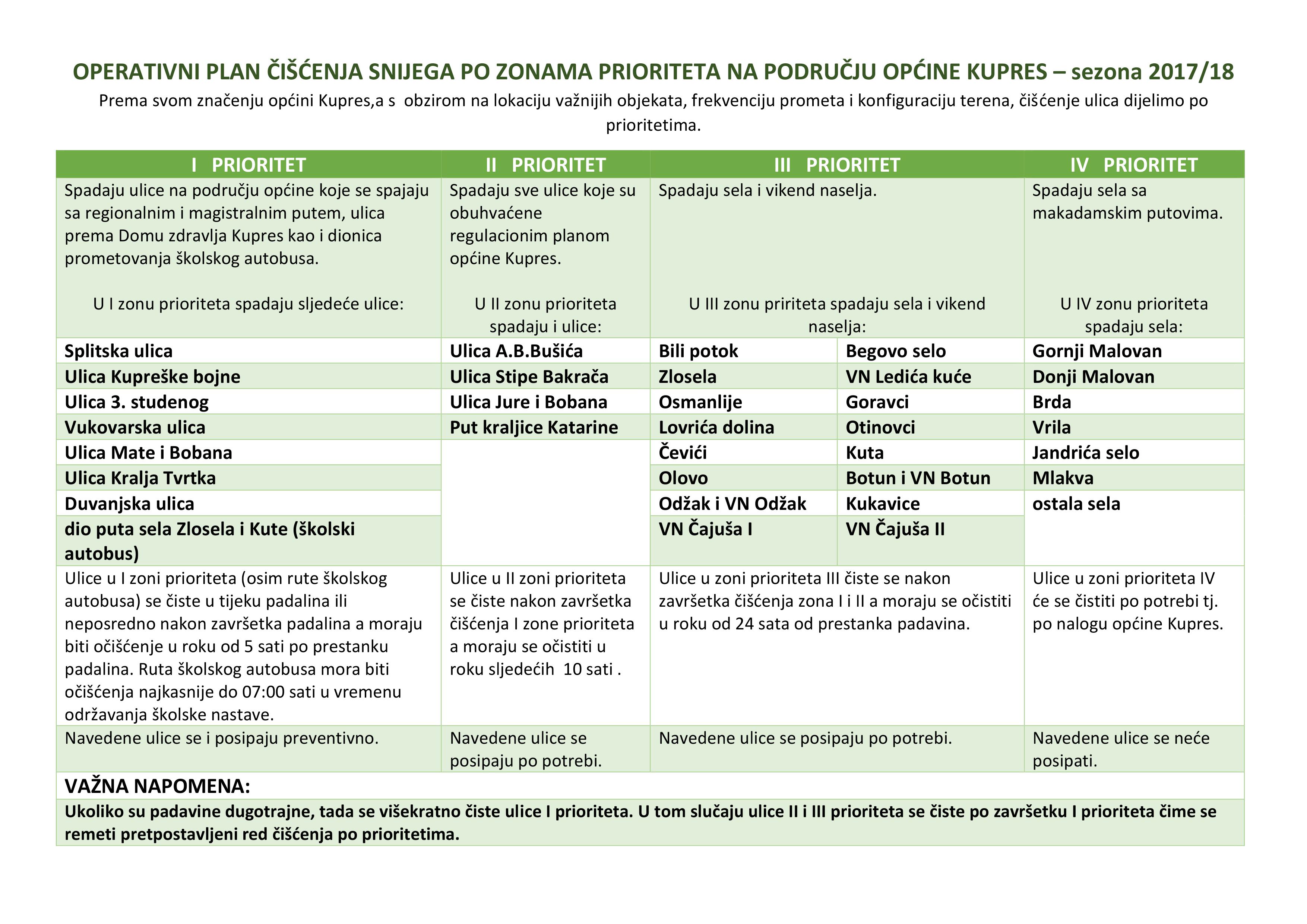 Operativni plan čišćenja snijega po zonama prioriteta na području općine Kupres sezona 2017/18